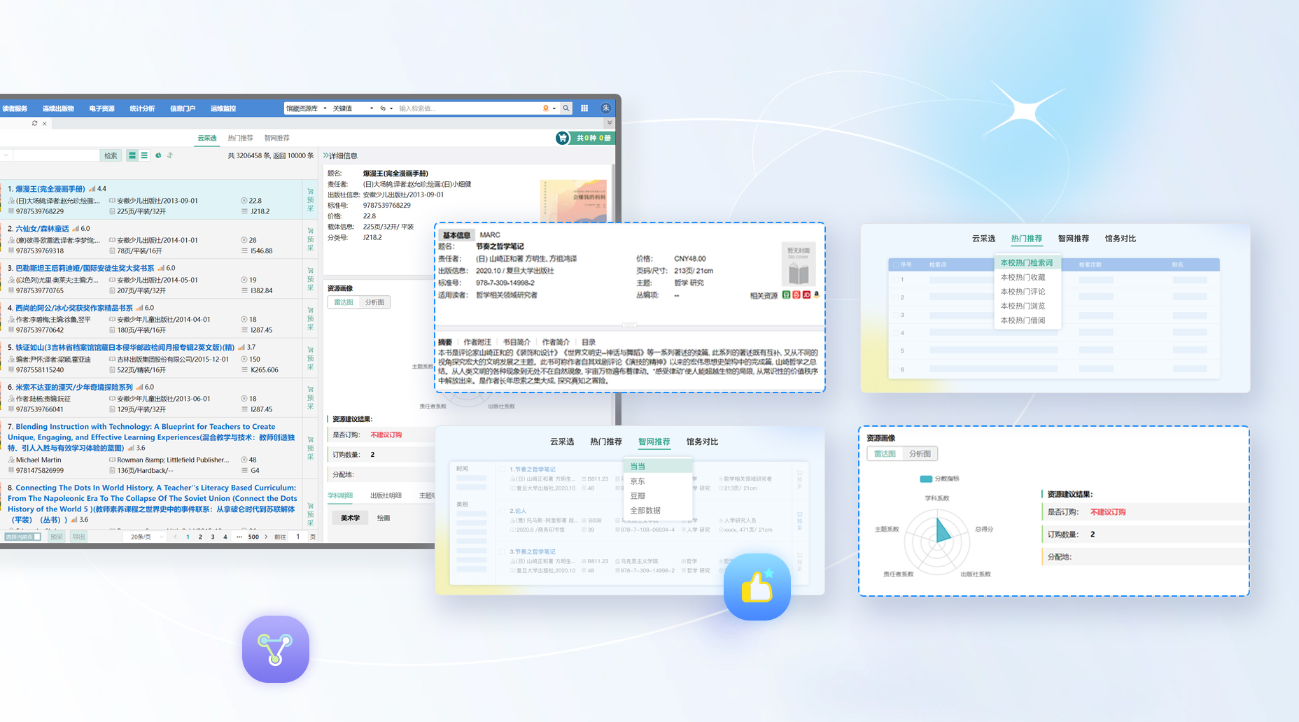 互聯(lián)網(wǎng)采選,依賴(lài)網(wǎng)絡(luò)數(shù)據(jù),實(shí)現(xiàn)熱門(mén)圖書(shū),熱銷(xiāo)圖書(shū),受關(guān)注圖書(shū),好評(píng)圖書(shū)的推送,分時(shí)段,分類(lèi)別呈現(xiàn),實(shí)現(xiàn)快速補(bǔ)充采選。