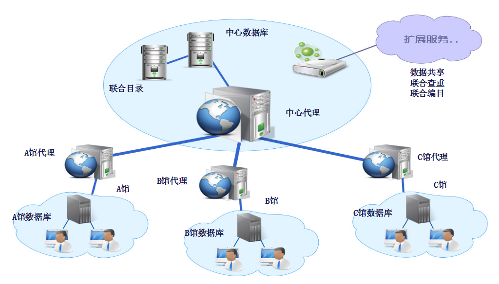 匯文公司立足揚州市圖書館的實際需求,采用分布式架構(gòu)方案搭建“區(qū)域流通”服務(wù)體系,該架構(gòu)除了易于快速部署和維護(hù)外,還能在保證 “區(qū)域流通”數(shù)據(jù)共建共享的同時,各成員館的其他數(shù)據(jù)獨立存儲,互不干擾。此外,匯文公司通過構(gòu)建中心層,實現(xiàn)多套CS系統(tǒng)和多套BS系統(tǒng)之間的“區(qū)域流通”服務(wù),為不同業(yè)務(wù)規(guī)模的圖書館提供便利。